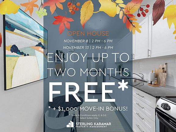 - Special offer! Limited Time Offer | Enjoy Up to 2 Months FREE on a 14-Month Lease + $1,000 Move-in Bonus for Move-ins by Dec 1!* (Select Suites) - Limited Time Offer | Enjoy Up to 2 Months FREE on a 14-Month Lease + $1,000 Move-in Bonus for Move-ins by Dec 1!* (Select Suites) *Terms & Conditions Apply.