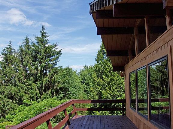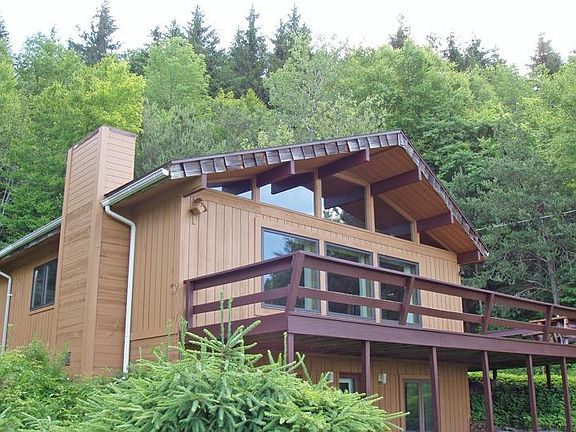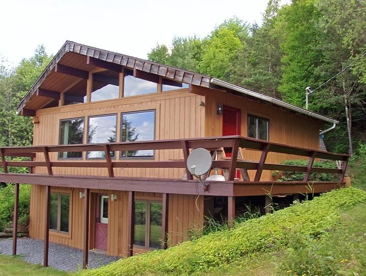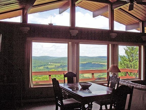 MOUNTAINTOP CHALET - High above the historic Hamlet of Andes with spectacular views of the valleys below. Spacious living area with cathedral ceiling, impressive stone fireplace with insert and kitchen island. Large master bedroom and bath on main level. Big wrap-around sundeck. Lower level with second bedroom, bath, laundry and family room opens to the outdoors. Family room has wood-burning stove on a brick hearth. Plus a garage under the house. There is an adjoining 13 acres of rolling meadowland with horsebarn and pond which can be purchased with the chalet for an additional $75,000.