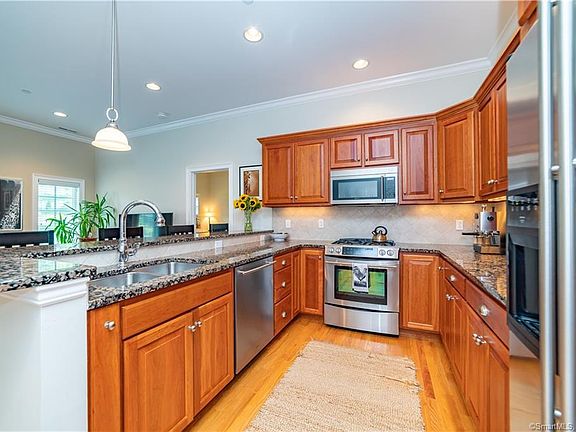 Fantastic opportunity to own a newer end-unit condo in Stonebridge Estates Luxury condo within walking distance to West Hartford Center and Blue Back Square. This 2 bedroom, 1 bath condo with soaring ceilings is perfect. Living Room/Kitchen combo is great for entertaining. Kitchen with granite, stainless steel appliances, and huge granite breakfast bar. Hardwood floors throughout. Master bedroom suite offers walk in closet , full bath and slider leading to outdoor patio. In unit laundry. Condo comes with 1 indoor parking space. Rooftop deck is an added bonus