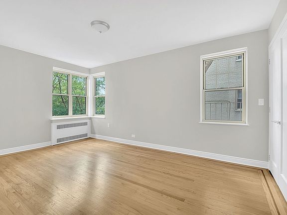 The pin-drop quiet oversized master bedroom has corner windows overlooking the serene park and trees and features two closet spaces with practical and attractive French doors. The second bedroom offers a large window, has one large closet, and can easily fit a queen-sized bed.