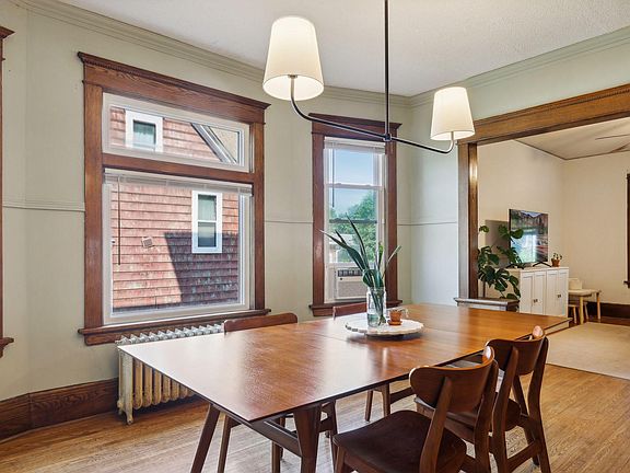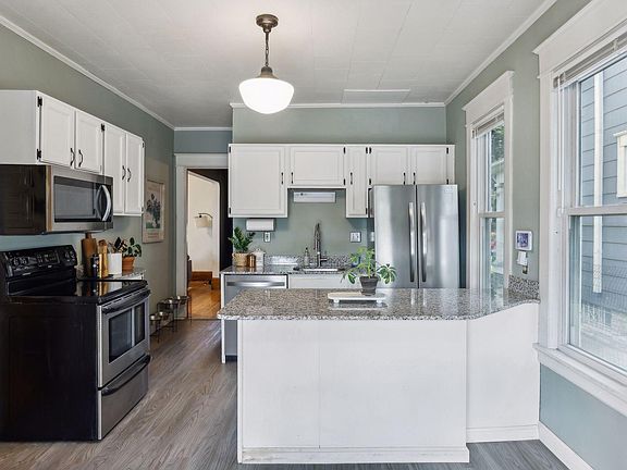 Welcome to this charming 2 story home that features three spacious bedrooms on one level & three baths, perfectly designed for comfortable family living & convenience. As you step inside, you'll be greeted by the warmth of natural woodwork & beautiful hardwood flooring that flows throughout the main living areas. The heart of the home is a large, updated eat-in kitchen, ideal for entertaining & family gatherings. The main floor also boasts a stylish bathroom & showcases a built-in buffet & stunning stained-glass window, adding a touch of historic charm & character. Additionally, this home offers plenty of potential for expansion on both the upper & lower level. Complete with a roomy 2 car garage & extra parking in the back. With its blend of timeless details & modern updates, this home is a perfect retreat for those seeking both comfort and charm! Recent updates include updated porch, flooring, light fixtures, water heater/boiler, dishwasher, granite countertops, etc. ONE OF A KIND! AS IS