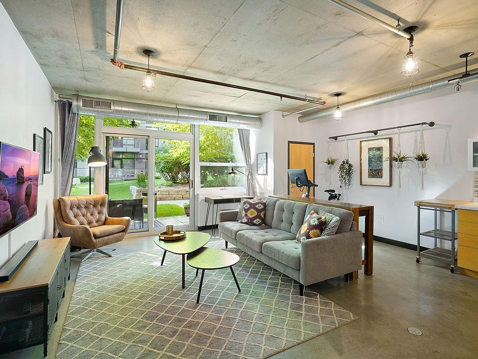 Awesome one bedroom loft with huge courtyard-level patio at 730 Lofts. Stainless appliances, in-unit laundry, polished concrete floors, new bathroom vanity, extra deep shower/soaking tub, heated indoor parking. Building offers fitness center, community room with pool table, common roof deck, live-in caretakers, on-site management, bike storage. Ideal North Loop location.