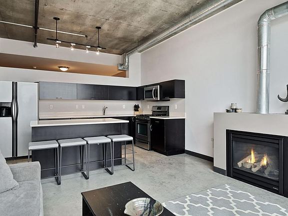 Big Western views and gorgeous sunsets from this 8th floor condo at 730 Lofts. 10' ceilings, stone counter tops, stainless appliances, in-unit laundry, fireplace, kitchen island, lots of closet space, private balcony, heated indoor parking. Building offers community room, common roof deck, fitness center, storage lockers, live-in caretakers, on-site management, and bike storage. Ideal North Loop location.