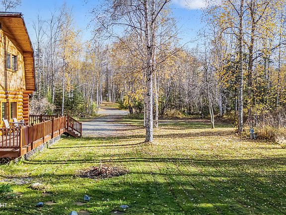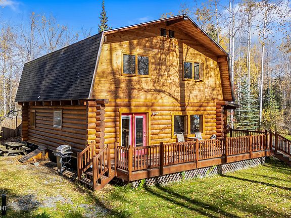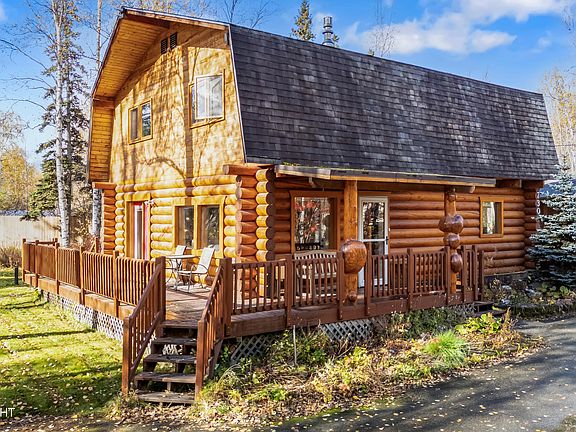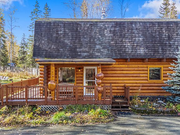 Welcome to this cozy log home featuring a spacious wrap-around deck, perfect for outdoor relaxation. Step inside to an open-concept main living area that seamlessly connects to the updated kitchen, showcasing new flooring and modern amenities. Enjoy two separate living areas and an office in addition to the 3 bedrooms. The yard is beautifully landscaped surrounded by your own Alaskan paradise.