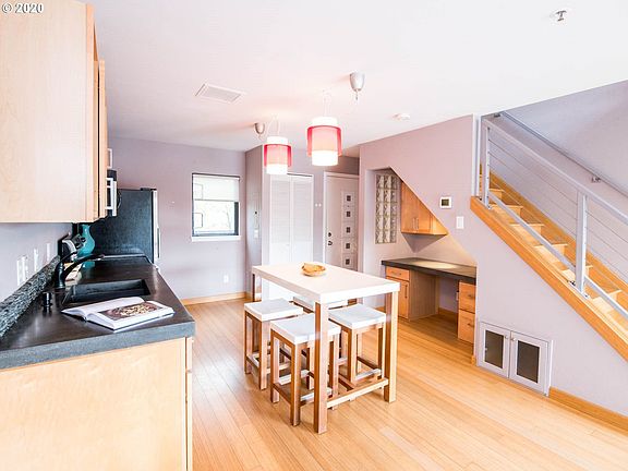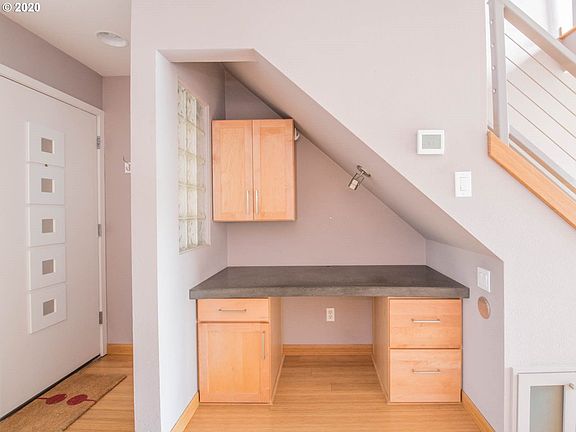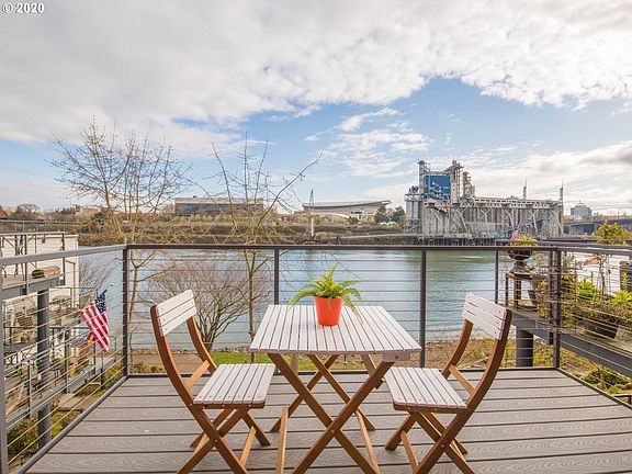Chic top floor loft style condo overlooking the Willamette River. Kitchen w/all appliances & concrete counters. Builtin desk nook makes perfect home office! Living room w/motorized blinds & wall of windows to huge balcony. Loft bedroom upstairs w/sweeping river views, closet built ins. Bathroom w/double vanity, granite top, large walk in shower. Bamboo floors throughout. Close to great food, transit, bike path, dog parks. Community courtyard w/fire pit, pool & hot tub. Covered parking spot.