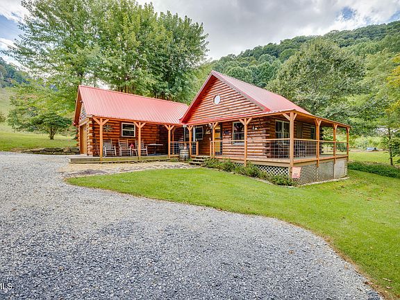 Welcome to a home where the sound of the rushing creek drowns out your every concern. This gorgeous TRUE log home in Roan Mountain is nestled perfectly with mountains as your backdrop and a new wraparound covered porch with Trex decking that lets you drink in your beautiful surroundings at every angle. This home has been renovated and perfectly maintained by the current owners. A mini split and propane fireplace were both added as well as an electric tankless water heater. New doors were installed throughout and the plumbing has been updated to Pex. A brand new filter system for the well ensures you will not have to be concerned with the quality of your water. Upon entering, you are welcomed by soaring vaulted ceilings in the open concept living room and kitchen area that has a new refrigerator and stove. The laundry room, full bathroom with new shower and vanity, and Primary bedroom are also found here enabling you to live solely on the main floor. Upstairs, you'll find the second bedroom in the loft. The garage and porch were added with a brand new metal roof five years ago. This quaint haven would be the perfect short term rental or escape from the busyness of life and is conveniently offered FULLY FURNISHED with everything you see here, including a lawn mower. And despite almost 200' of rushing creek, the home itself is NOT in a flood zone and does not require flood insurance. And although Helene did some damage on Shell Creek Rd, it did not touch this beautiful home. Come experience tranquility in the mountains.