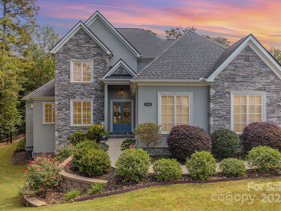 The gorgeous stacked stone and hard stucco exterior exudes timeless elegance, while the thoughtfully designed interior takes open concept living to the next level. The natural light streaming through the numerous oversized windows brighten each space naturally! The kitchen boasts a plethora of white cabinets, stainless steel wall oven/microwave, refrigerator, dishwasher and gas cooktop! The kitchen also has plenty of space to sit at the breakfast bar or add a table for a casual eat-in kitchen experience. The separate dining room has windows overlooking the fenced-in backyard and golf course. The spacious living area has an amazing contemporary gas wall fireplace to warm chilly evenings and create a relaxing ambiance. The primary suite boasts high ceilings, plenty of room for large furniture pieces and it's own bathroom suite. Massive shower, full wall vanity with 2 sinks, separate water closet and walk-in closet provide an aesthetically pleasing visual and relaxing spa-like getaway!