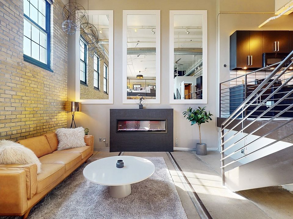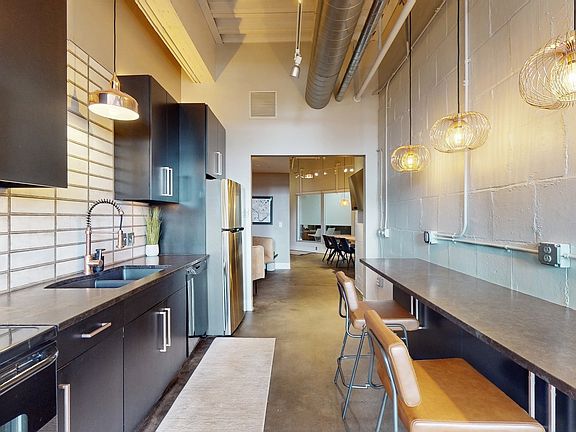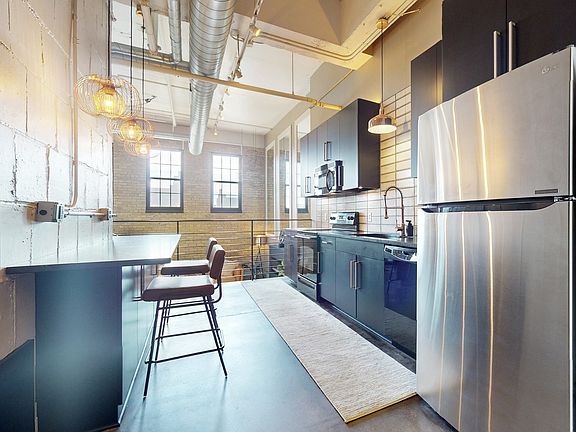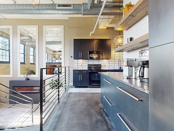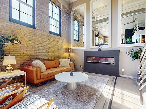 Spacious corner condo with tons of windows and natural light! Soaring 16 foot ceilings! This building was originally the Cream of Wheat Factory, converted to residential lofts in 2007. Historic train tracks run through the lower floor. Sleep where the trains brought in the wheat! Recently updated kitchen with granite countertops. Elfa closet systems throughout the unit, and tons of storage. Loft can be used as a second bedroom. Large deep freezer included. Blackout remote control, energy efficient shades. Electric fireplace with heat and many color options. One indoor heated garage spot with dedicated EV charger, and one outdoor assigned parking spot are included in the rent. Ample guest parking as well. Community terrace with city views is easily accessible and close to unit. Other amenities include an outdoor gas fire pit, large fenced dog run, community party room, community conference room, fitness center on first floor, community garden, lots of lush, green space to enjoy on the grounds. This is a very quiet condo, you rarely hear neighbors. Very comfortable living within walking distance of Costco, multiple breweries, Honour Coffee, Zakia Deli, Norseman, the Quarry shopping area (Target, Petsmart, Cub and more!) Tenant responsible for electricity. All other utilities included in rent, including high speed internet and cable TV.