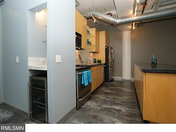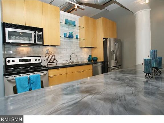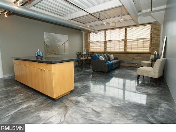 Condo unit w/ vaulted ceiling. Great epoxy concrete reflector flooring and open concept throughout the condo. You'll love the location and industrial look with marble splash back in the kitchen, concrete countertop, and maple cabinetry. New wood blinds and stainless steel appliances. It'll be something you won't want to miss! See supplements for detailed info.