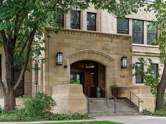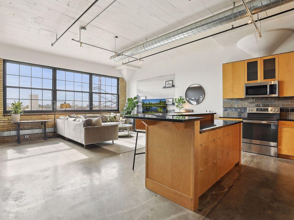 Your premier opportunity to live in The CW Lofts is available! In the historic and former Cream of Wheat factory situated on a park-like setting! Live in a place that blends industrial and modern together so perfectly! Spectacular south-facing condo filled with natural light, and amazing views of downtown! Quiet concrete construction, exposed brick & beams, and high ceilings! Kitchen features granite counters, center island, tile backsplash, beverage fridge, and new stainless steel appliances in 2022. Air conditioner serviced and improved last year. Two bedrooms, large walk-in closet, and in-unit laundry. High-end and fun wallpaper in the bathroom. You will love the amenities including party room, meeting room, fitness room, patio with grill, outdoor firepit, expansive grassy spaces, fenced dog area, and private garden plot. Keep your bicycle in the garage. Association fee includes water, sewer, garbage, heating, cooling, internet, and cable – everything except electricity. Quiet, in-demand, fun, and convenient location!