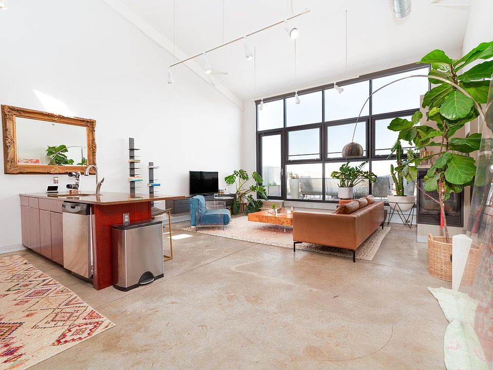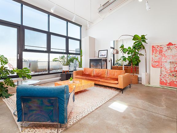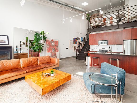 Some features include a rare fireplace in unit, a large private patio with gorgeous views of the Minneapolis skyline, and recently installed remote controlled shades on both the floor to ceiling windows and skylights, and a recently installed custom shelving and storage unit in the lower-level bedroom – including a Murphy bed!