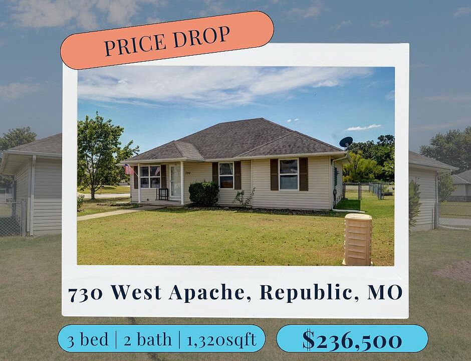 Welcome to 730 W Apache Street in Republic!If you've been searching for a home that is move-in ready without all the fuss, this one is it. Tucked inside the established Indian Trails subdivision, this 3-bed, 2-bath, 1,320 sq ft home offers a warm and inviting layout that feels just right for everyday living.Step inside to find a cozy living room anchored by a fireplace, a functional kitchen with a dining area and breakfast bar, and a comfortable primary suite all on the main level. Neutral finishes, ceiling fans, and a practical mix of carpet and tile flooring make this home an easy fit for any style.Outside, the property features a full chain link fenced yard on a landscaped corner lot, perfect for pets, play, or enjoying evenings outdoors. A 2-car garage with rear entry provides convenience and storage.With Republic schools and a location just minutes from shopping, dining, and Highway 60, this home is the definition of turn-key comfort. Whether you're a first-time buyer, downsizing, or simply looking for a solid, easy-care home, 730 W Apache is ready for its next chapter -- and its next owner.