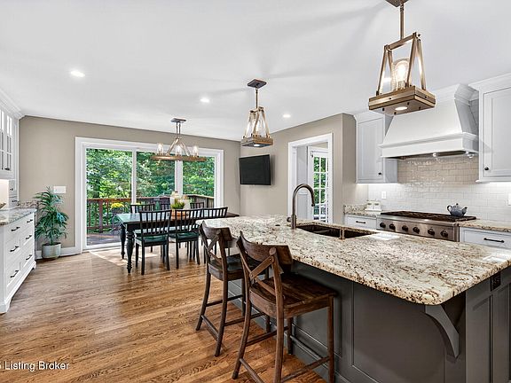 Located at the end of a cul-de-sac in the Fox Harbor neighborhood, this 5-bedroom, 3.5-bath brick Colonial blends timeless architecture with modern luxury in a wooded setting. Pristine hardwood floors, recessed lighting, and elegant woodwork set a sophisticated tone throughout the main level. A private office is found off the entry, while the formal living room opens through double doors to a warm family room with built-ins, a beamed ceiling, and access to an expansive deck overlooking the beautiful yard. The renovated eat-in kitchen is both stylish and functional, showcasing Amish-crafted inset cabinetry, granite counters, GE Café stainless appliances, a six-burner gas range with custom hood and double ovens. The large island serves as the kitchen's hub, with seating, sink, dishwasher, and storage. A roomy walk-in pantry adds to the efficiency and charm. The mudroom/laundry is a standout, with Electrolux appliances, utility sink, granite counters, custom cabinetry, and built-in bench seating, a space that feels straight out of a design magazine. Upstairs, the spacious primary suite includes a walk-in professionally organized closet and bathroom with dual vanities, glass shower, and private water closet. Three additional bedrooms with ample closet space and a stylish full bath complete the second floor. The finished walkout basement is versatile and could serve as an in-law's suite or extended living space with high ceilings, a family room and wet bar, a full bath, and a bedroom currently used as an exercise space. Ample unfinished storage and mechanical space round out the lower level. From the lower level, doors open to a concrete patio beneath the deck, while a separate stone patio with a gorgeous outdoor fireplace with attached wood storage boxes extends entertaining and relaxation options. A fully fenced backyard has a rear gate located near the Putney Pond & Woodlands, a nature preserve owned and managed by the city of Prospect. Additional features such as a two-car garage, plus thoughtful updates throughout make this dreamy home move in ready. The natural surroundings pair beautifully with nearby shopping, dining, coffee, and daily necessities along US-42. Residents also enjoy close proximity to Hunting Creek Country Club, a private club offering golf, swimming, tennis, and pickleball with membership. Make plans to see 7300 Fox Bluff today - it could very well be your new happy home!
