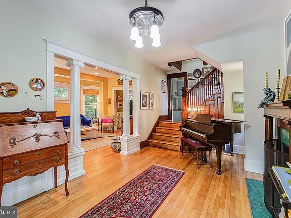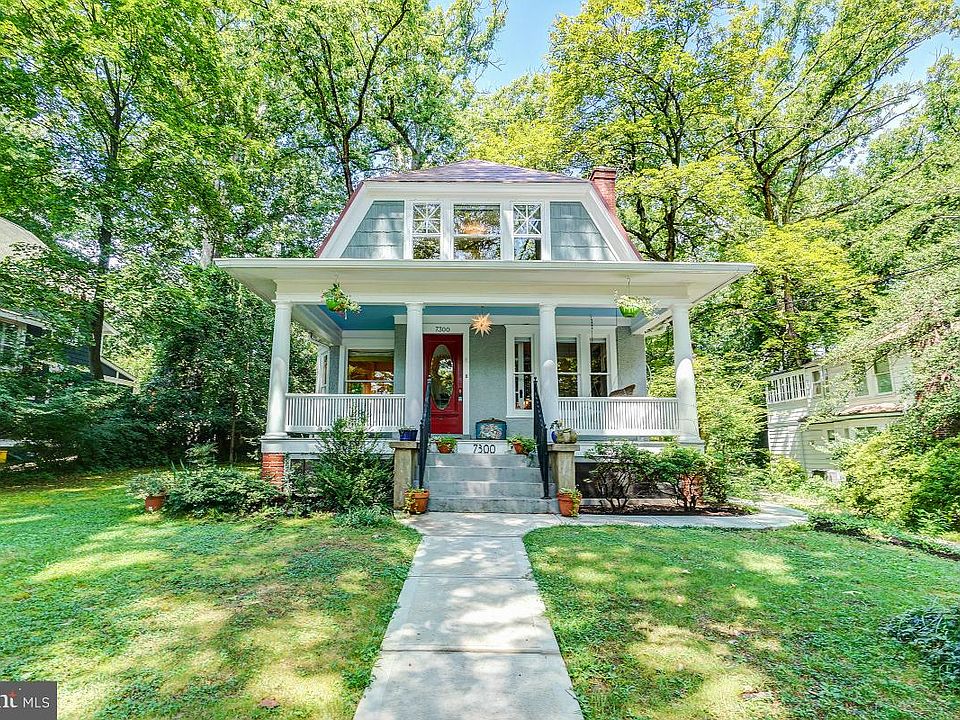 Welcome to this magical bungalow with an inviting front porch on a beautiful block just steps to the Metro. Circa 1918, this distinctive property features glorious architectural details, wonderful woodwork and floors, exquisite chandeliers, high ceilings, handsome fireplaces, striking windows, six panel wood doors, vintage glass doorknobs, and recessed lighting. This enchanting home offers a convenient vestibule entrance with beveled glass front door, a handsome sitting parlor with a wood burning fireplace and gorgeous wood accents, a light-filled living room with recessed lighting, sophisticated dining room with a bay window, display shelving, and pass through to the kitchen. The spacious bright and expanded kitchen includes a breakfast area and access to the expansive stone patio. The kitchen features granite counters, KitchenAid stainless steel appliance suite, glass front cabinetry, a five-burner gas range with a double oven, and a decorative tin ceiling. The main level is complete with a versatile bedroom / office with an attached dual entry full bathroom. There are three bedrooms, a sleeping porch, and an updated bathroom on the second level, including the primary bedroom with two closets and a delightful alcove with custom built-ins and drawers. The lower level includes a cozy family room with a gas fireplace and custom built-ins; a renovated full bathroom with a travertine vessel sink, a glass enclosed shower and a towel warmer; a storage room, a Cedar walk-in closet, and a laundry room. The picturesque generously-sized private yard boasts beautiful mature trees, a stone patio, a fenced backyard, and a large shed. Enjoy living in eclectic Takoma Park; the location offers all the allure and convenience of this very special area situated just steps from the Red Line Metro station and Busboys and Poets. Relish the warm sense of community as well as ready access to shopping, restaurants, and entertainment in both Takoma Park and wonderful, vibrant downtown Silver Spring. Ideally situated near Belle Ziegler Park & playgrounds, Takoma Park Citizens' Center, and steps to schools K-8. See you there!