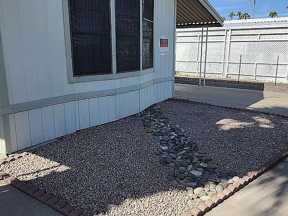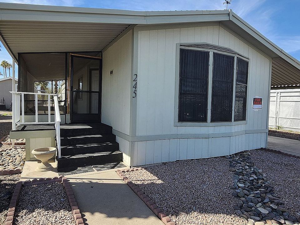 Modern, roomy mobile home. Vaulted ceilings in the living room. Manufactured wood floors throughout. Features 2 bedroom, 1 bath. All new appliances which includes stove/oven, dishwasher and refrigerator. Microwave oven and air fryer are also included. Like new washer & dryer - 3 yrs old. There is also a large screened patio. Features fans in livingroom, and both bedrooms. Central air-conditioning and heat, and a swamp cooler. A large shed with shelving. Also included a gas BBQ grill. Double car parking in the carport. Livingroom - 15' x17', Kitchen - 12' 3" x 13', Master Bedroom - 12' x 12' 7", 2nd Bedroom - 12' x 10', Screened Patio - 7 1/2 ' x 30' Located in a 55+ community.