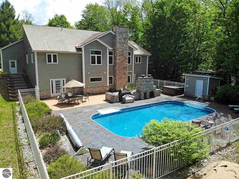 GORGEOUS HOME on 17 acres in the Heart of Northern Michigan. Minutes from skiing and golf at Schuss & Boyne. 45 min to Traverse City, Gaylord, Grayling, or Cadillac. Interior features include: Granite counters, hardwood and tile floors, glamorous master BR suite w/soaking tub and an Opra style closet. LL has beautiful sauna, full bar, fireplace and additional BR/office/workout rooms. The windows overlook an oasis backyard including an outdoor fireplace & pizza oven, in-ground swimming pool, hot tub and full volleyball beach sand court. 3 car attached garage and 32 x 40 detached garage, perfect for storing boats, snowmobiles, tractors & campers. Close to snowmobile & ORV trails and minutes to the world famous Torch Lake.