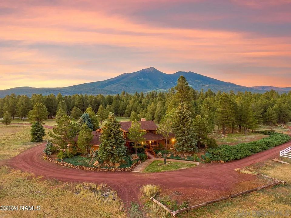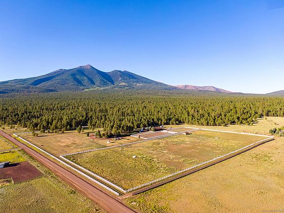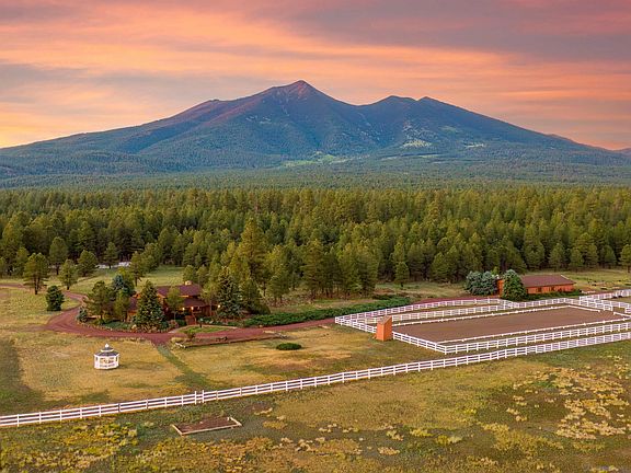 Discover the beauty of this stunning home, perfectly nestled amidst the majestic San Francisco Peaks. Set on an expansive 11.79-acre lot backing up to the Coconino National Forest, this thoughtfully designed 1,921 sq ft residence features 3 bedrooms and 2 bathrooms. Inside, every window offers breathtaking views, enhanced by newly added remote-controlled Hunter Douglas shades. The kitchen is a chef's dream, equipped with a top-of-the-line Fisher and Paykel double dishwasher, a new stainless steel double oven, and a deep copper sink. Flagstone and hickory floors throughout add a touch of rustic elegance. Beyond the main house, you'll find a 2,814 sq ft heated barn with 6 oversized horse stalls, Nelson waterers, a workbench, and a tack room with water. The property also includes two large turnout areas, one featuring a competition dressage arena, and the other a jumping arena. There is also plenty of room for a pasture. Two wells provide ample water supply for the property. Conveniently located less than a mile from Snowbowl and less than 5 miles from town, this property offers unparalleled accessibility. Enjoy unlimited horseback riding with direct access to the National Forest from your backyard. Bring your horses out of the heat to this cool mountain retreat. With no HOA restrictions, you have the freedom to personalize and utilize the property as you wish. Experience the perfect blend of luxury, privacy, and equestrian paradise when you tour this remarkable property.