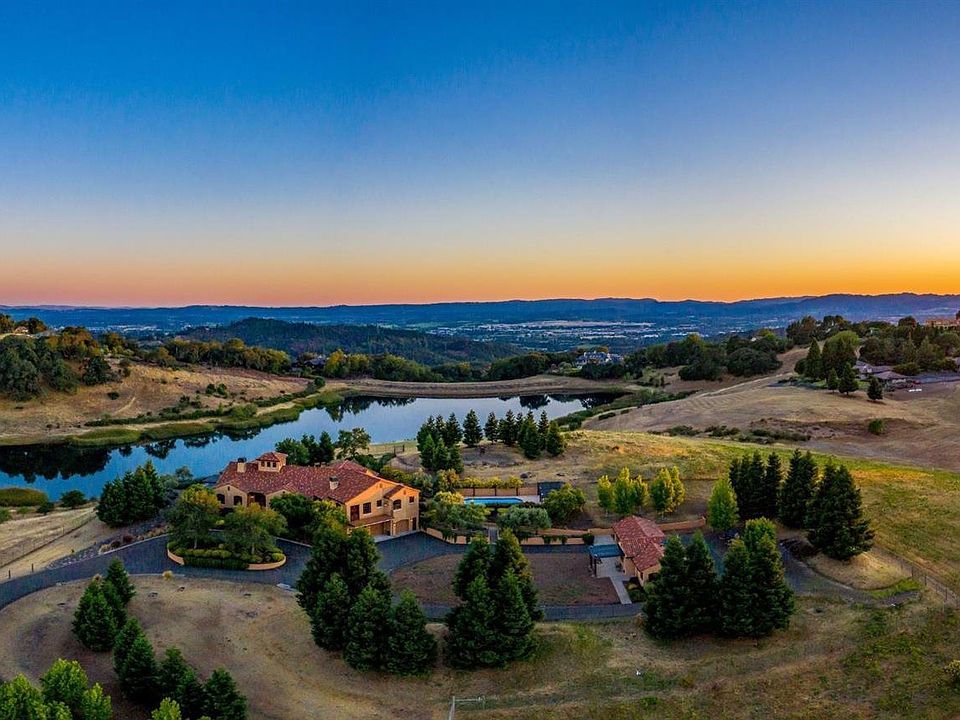 Immaculate Mediterranean Estate behind the gates of Shiloh. This custom built property sits on over 12 acres with stunning 360 degree views of Sonoma County, vineyards and the bordering private lake. With just over 5000 square feet of single level living in the main home, this estate also offers a guesthouse, pool, gardens, potential wine room and an elevator from the 3 car garage level. Quality upgraded finishes throughout both units include stone counter tops, custom cabinets and appliances, custom built-ins in the entertainment room, office and master walk-in closet & a Lutron lighting system. Multiple outdoor entertaining areas include and outdoor fireplace, and a view deck. Located on one of the highest elevations in Shiloh, this private and gated estate is truly remarkable.