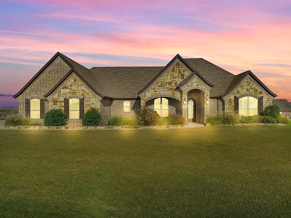 Welcome to this exquisite custom-built home, nestled on a 1-acre lot with breathtaking panoramic views of the Bass Cattle Ranch, Downtown Fort Worth, and the Carroll Ranch. As you step inside, you're greeted by a brick veneer foyer and a heavy iron front door, setting the tone for the craftsmanship found throughout the home. Throughout the home, stunning coffered ceilings add architectural interest and enhance the sense of space in the living and dining areas. The flex space includes a secure safe room with a steel door for peace of mind. A dedicated study offers a wet bar, built-in shelving, a standing desk, and custom storage, providing both function and style, making this space ideal for a home office or library. The barn doors are custom built from reclaimed wood from an old 1800's Granbury Dairy Farm. The owner's suite includes a spa-inspired bath with a jetted soaking tub, oversized walk-in shower, and his and hers vanities with plenty of storage. The expansive walk-in closet includes custom built-ins for maximum organization and luxury The sparkling pool and spa offer a relaxing retreat, while the expansive patio features an outdoor kitchen, perfect for hosting summer cookouts. The fireplace creates a cozy ambiance for cool evenings, while the view from this vantage point will leave you in awe, with sights stretching over the ranches and skyline of Fort Worth. This home offers the best of both worlds — the tranquility of expansive ranch views and the convenience of being just minutes from Downtown Fort Worth, shopping, dining, and entertainment. With easy access to major highways, you’ll enjoy both peaceful privacy and urban amenities.