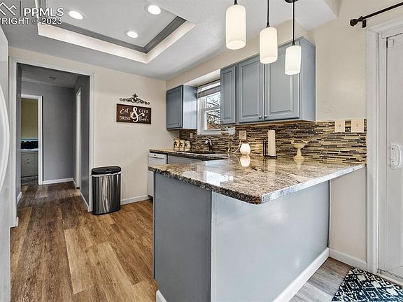 Welcome home to this super cute bi-level home in Fountain! The upper level features the living room, dining area and kitchen all with luxury plank flooring. The updated kitchen has granite countertops with a pretty glass tile backsplash, stainless steel appliances, and a pantry. The dining area has walk-out doors to the composite deck for access to your outdoor oasis. An expanded patio and large, privacy-fenced backyard make a great space to hang out on those awesome Colorado evenings. The upper level of this home also has two bedrooms, including the master with two closets, and a full bath. On the lower level are a large family room, two more spacious bedrooms, another bath, and the large laundry room with storage. Need more storage or workshop room? In addition to the 2-car attached garage, this home has a 14x30 detached garage on the side and a double-sized storage shed in the backyard. Other amenities include a 2021 furnace, 2021 water heater, neighborhood skate park, backyard playset, fully fenced yard, central air, and washer/dryer included. Hurry! This won't last!