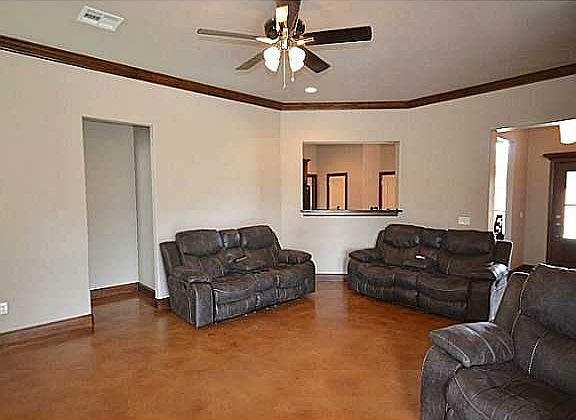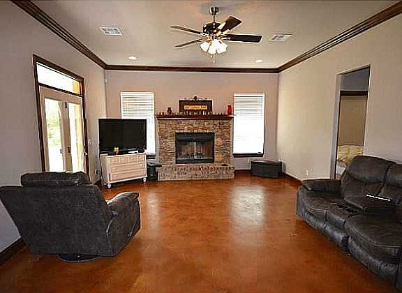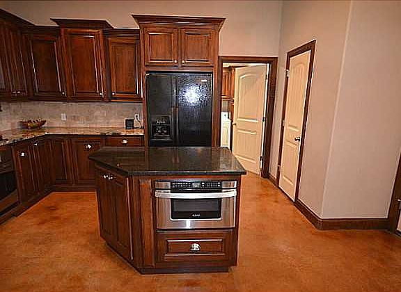 Stained Concrete floors make this home unique & easy to care for. Open living with fireplace, Great kitchen with eating space, pantry, awesome 5 burner gas range. Functional island with microwave gorgeous granite, stylish stainless steel sink, rich wood cabinets. The master has a large walk-in closet that leads to the utility room. Master bath has walk-in dual head shower. Covered patio easy access to commute to OKC and Tinker AFB!