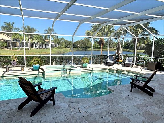 Surround yourself by water on two sides with no neighbor on one side! Behind the gates off University Park & CC you will find this maintenance free home that has been completely renovated in the last few years situated on a private lake lot with open wide lake views. Newer travertine 24x24 tile flooring throughout for allergy free living. The open great room features high ceilings, gas fireplace and custom built-in bookcases. Completely renovated kitchen with 42" soft close wood cabinets, deep drawers, thick granite counter tops, stainless steel appliances, beverage fridge and flows to casual dinette with French doors opening to the pool area. Beautifully redone bathrooms with new wood vanities, quartz countertops, and detailed tile work. Enjoy the Florida lifestyle in the extended travertine lanai with large heated pool, spa, outdoor kitchen, dedicated pool bath and two covered entertaining areas. Two car garage with additional side load golf cart, Elfa wiring shelving along with ample storage areas, newer HVAC, all lanai screws were replaced as well as the screens, recently painted interior, custom built-ins in the master walk-in closet, newer wide baseboards and crown molding, double glass entry door, brick paver driveway and walkway, new pool heater and pool pump. Cul-de-sac location with convenient back gate entrance dedicated to residents only. HOA fees includes: community heated pool, yard maintenance, mulching, basic cable & gated entrance. Recreational district fee of $1,065 per year.