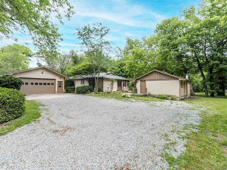Here is your private paradise. This is a unique property located at a dead-end road in Wagon Wheel Ranch, 3 miles east of Andover, a community of neighbors who all love easy living outside the city. This is a 1.5 acre property, with a 2BR/2BA cabin (1624 sq ft) PLUS a 1BR/1BA cottage (450 sq ft) both with kitchens and living areas, 4-car oversized detached garage/shop, a greenhouse, storage shed, underground storm shelter, small fishing dock, all along 300 feet of waterfront along the Indianola River among mature trees. Float downstream to Santa Fe Lake! Cabin has pine wood floors and fresh paint throughout in the open living/dining/kitchen area. Kitchen has updated appliances and an eat-in bar. An enclosed sunroom with a wall of windows facing the river for a fantastic panoramic view. Both baths are updated and there is a utility room with space for laundry. The cottage, with quaint back stoop, also has an open floor plan that guests will love. Hammocks under the trees, wildlife, fishing poles, BBQs and bonfires - what a lifestyle. Fishing is said to be very good and the river is thought to be about 10 feet deep in this area. Wagon Wheel Ranch offers boat storage nearby, a playground and a burn pile. Neighborhood cleanup days are scheduled for volunteers to beautify the area. 4th of July and Halloween are neighborhood favorites! New septic system recently installed. Seller is selling in "as-is" condition.