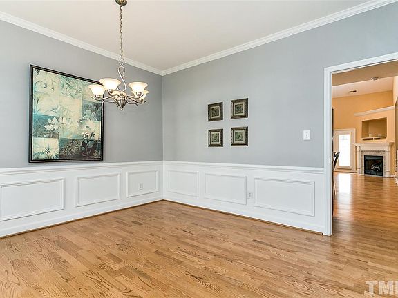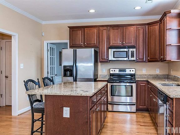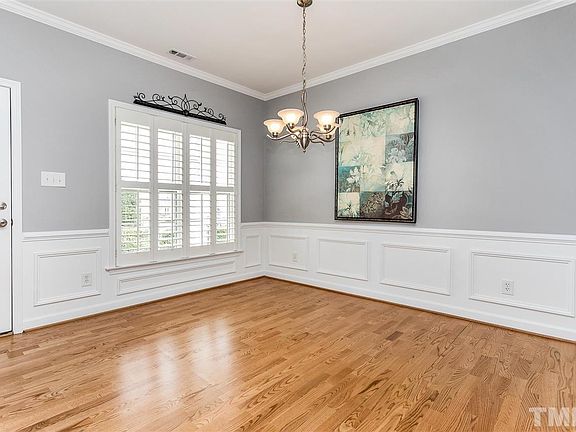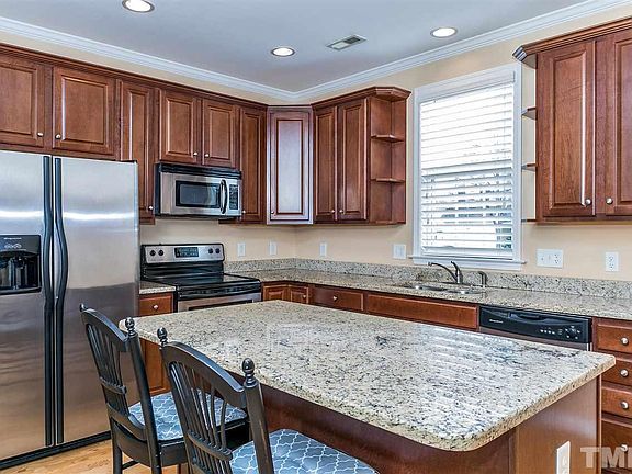 End unit townhome w/ downstairs master suite in Mulberry Park. Open floorplan w/ hardwoods throughout entertaining areas. Plantation blinds on main flr. Kitchen w/ granite countertops, SS appliances & large island w/ seating for two. Sep. Dining w/ wainscoting. Updated master has dual vanity, garden tub, sep. shower & large closet. Screened porch off family rm opens to patio area w/ back & side yard areas. Additional 2 bedrooms upstairs w/ loft area & bonus room. New Carpet! Near Brier Creek, 70 & 540!