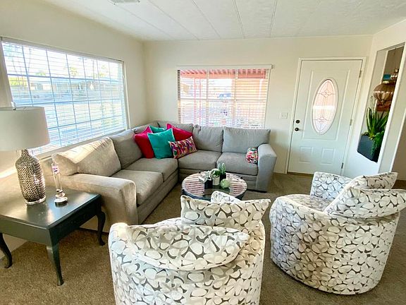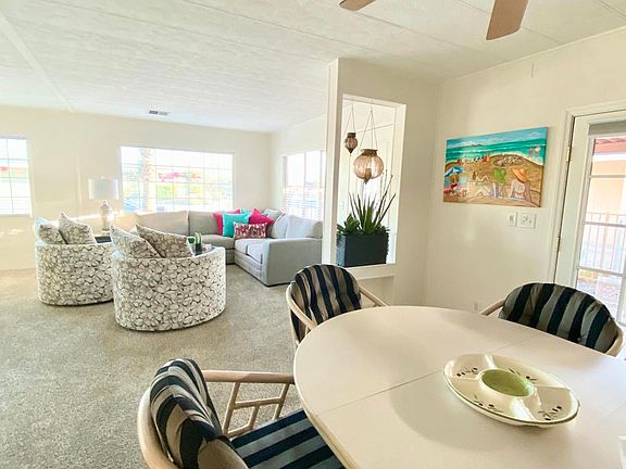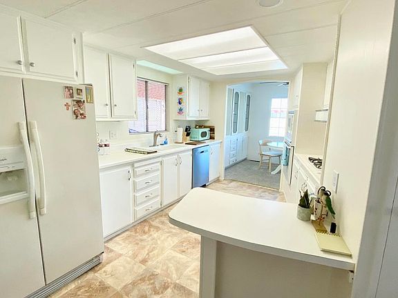 Date of Manufactured is Aug 17, 1976 Makes this property available for Conventional Financing. Property has been beautifully maintained. Open floorpan with Two large front windows with side window to allow sunlight & Mountain Views. French Doors opens to large covered patio the length of the home. Patio has 4 sections of manual sunshades to hide the sun or for privacy. Four foot high iron fence encloses the whole patio to allow your special pets to roam around safely. Located on a private side street & walking distance to one of the three community pools. Long covered carport with storage shed leads to the oversized 4792 sf lot with an amazing Large Back Yard ready to be developed with your personal imagination. Home totally painted Interior & exterior in 2023. A/C & Water Heater replaced 2022 Three ceiling fans installed 2023, Carpet replaced 2023. Roof professionally repaired along with two coats Elastomeric 2024. Replaced 3 ceiling fans in 2023. Washer/Dryer/Dishwasher purchased in 2024 to remain.This is a 55+ community & You own the Land. This home is ready to move in and enjoy.... includes HOA $400 includes Cable, Internet, trash, 24 hr guard gated, 3 pools , gym, tennis & pickleball, bocci ball, indoor shuffleboard, restaurant and lounge. It also has a 18 hole golf course & Pro Shop, with 'GOLF included' in your HOA..... A wonderful senior community with 1900 plus homes. A friendly neighborhood.Remember, Date of Manufactures Aug 17, 1976
