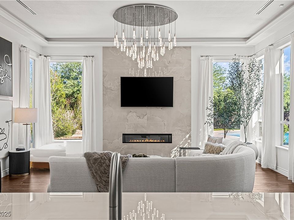 Set within the gated enclave of Canyon Mist Estates, this modern single-story home offers refined design, privacy, and a resort-style backyard rarely found in Las Vegas. Inside, soaring ceilings and natural light create an open, effortless flow. Glass entry doors open to a front office with real presence and flexibility. The kitchen anchors the home with European-style cabinetry, Calacatta quartz, polished Dekton surfaces, and a waterfall island that becomes the social center of the home. Soft LED ceiling lighting, RH fixtures, and sleek linear AC vents elevate the finish throughout. The primary suite is positioned in its own private wing with direct backyard access, a marble bath, and a custom walk-in closet. Secondary baths carry matching marble finishes for consistent flow & design continuity. Outdoors, the backyard unfolds with a pool, spa, and covered patios designed for both entertaining & quiet retreat. A home where layout, light, and lifestyle align with intention. Call Today.