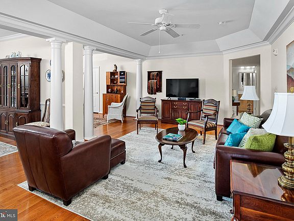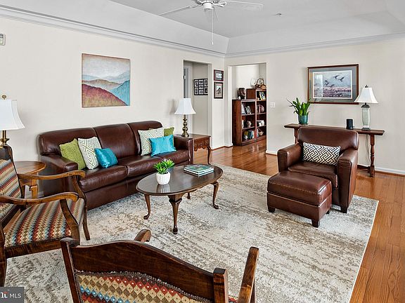 Stunning Dogwood model located in one of Howard County's most desirable 55+ neighborhoods! This top floor unit has great views of the golf course and community amenities and is loaded with all the right upgrades. Hardwood flooring in the foyer and main living areas; neutral paint throughout; upgraded kitchen with 42" cabinets, beautiful Quartzite countertops, custom backsplash and a sunny breakfast area; large living room with tray ceiling; separate dining room with crown molding and chair rail; relaxing sunroom with great views of the golf course; versatile bonus room ideal for home office or hobby room; primary bedroom with tray ceiling, walk-in closet and access to a luxury bath with double sink/vanity with upgraded counters, jetted tub and frameless shower; spacious second bedroom with ceiling fan and access to a private bath; convenient laundry room with extra storage. This unit has a one car garage in the building with double parking pad. Great community amenities include clubhouse, pool, exercise room and pickleball!