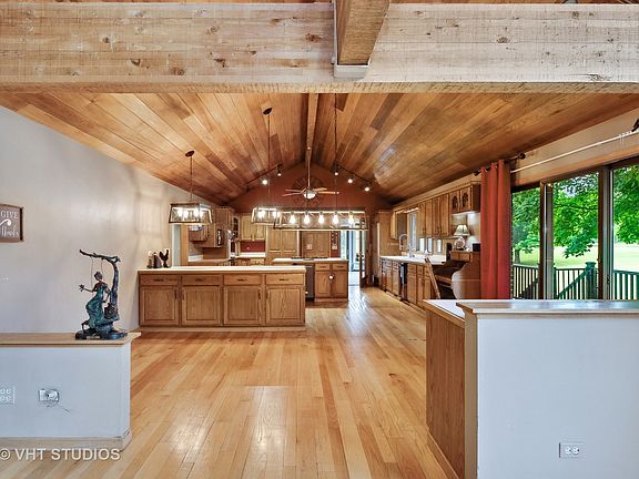 Welcome home to this gorgeous custom-built sprawling ranch in the well-known Turnberry community. The million-dollar views in backyard make this property unique! This all-brick ranch home has a very open concept from the moment you walk in. The great room has wooden beams that will make you feel right at home. There are hardwood floors throughout the main living spaces on the first floor. On the main floor are 3 bedrooms and 3.5 baths. All three bedrooms have attached bathrooms. Sellers are offering an $8000 credit for flooring in the upstairs bedrooms. The master bath has 2 separate toilets and an upgraded, over-sized steam shower plus a claw tub. There are two separate walk-in closets and so much sunlight with all the sliders around the room that go out to the beautiful wrap around deck. The spacious kitchen has a big walk-in pantry and so much room for entertaining. It has a bonus island/counter area with a little sink great for entertaining or crafting. Off the kitchen, there is a 4-seasons room with great views of the yard and windows all around. In the finished, walkout basement you will find one bedroom and 1.5 baths plus a bonus room great for a gym or office. the half bath in the basement was just renovated in 2023. The basement comes with a complete 2nd kitchen which could make the perfect in-law arrangement. There is a wet bar in the basement with 2 mini fridges and an ice maker. This is the perfect space for entertaining. The dual sided fireplace in the center of the basement makes this space warm and cozy. The amount of slider doors around the back of this home will impress you! The basement tile floor is heated. There is an attached 3 car garage with a bonus garage at the back of the house to use for extra storage. The boat under the deck is going with the house. Seller is offering a $8,000 credit for carpet and paint. The deck was redone in 2021 with Tek Deck material which is great for Maintenace-free living! The house is on the 9th hole on the Turnberry Golf Course. There are great fishing spots at the ponds in the neighborhood and the clubhouse is right down the road and has many family activities. This is a golf course community so bring your golf carts to cruise around the neighborhood.