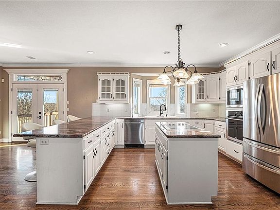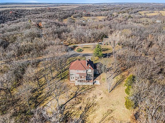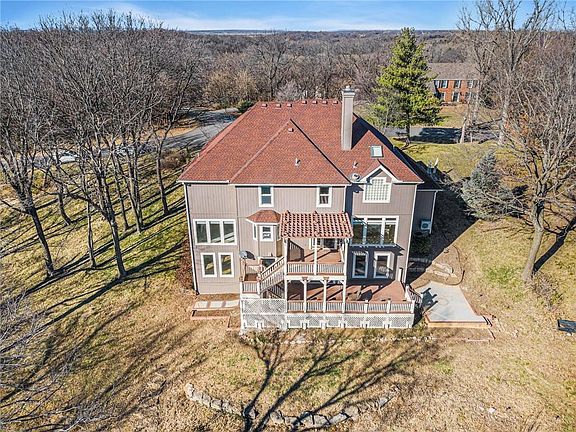 Nestled in the wooded setting of Emerald Hills neighborhood, this 2 story custom home on acreage offers the tranquility of county life with KC amenities nearby to enjoy! A welcoming tree-lined street brings you home as you feel the busyness of life starts to fade. Grand two story entry with hardwood double staircase. Designated office features built in shelves, French doors, hardwood floors and natural light through window overlooking front yard. Kitchen is a chef’s delight featuring abundant workspace, white cabinets, granite countertops, wood floors and opens into hearth room with stone fireplace and French doors to access deck. Dining and family room have floor to ceiling windows overlooking private treed acreage. Formal dining & living room fill with natural light and offer entertaining areas to fill with holiday cheer. Upstairs 3 spacious bedrooms plus primary suite await. Private balcony, hardwood floors, tiered ceilings and sitting room, add pampering touches to the oversized primary suite. Walkout basement offers a wall of floor to ceiling windows to take in private countryside view, a wet bar, full bath, large storage room, plus a 5th bedroom large enough for a separate sitting area or gaming space. Outdoor entertaining with two level deck and almost 5 acres of land to enjoy. Underground fence adds boundary for pets without blocking view. Dual heating and cooling. Award winning Park Hill School District, plus location to highway, downtown amenities and airport. Courtesy floor plan included in property pictures. This park-like lifestyle is ready for your holiday enjoyment!