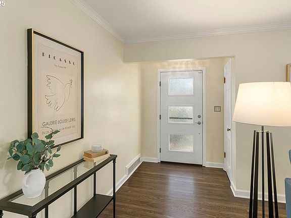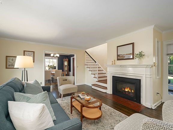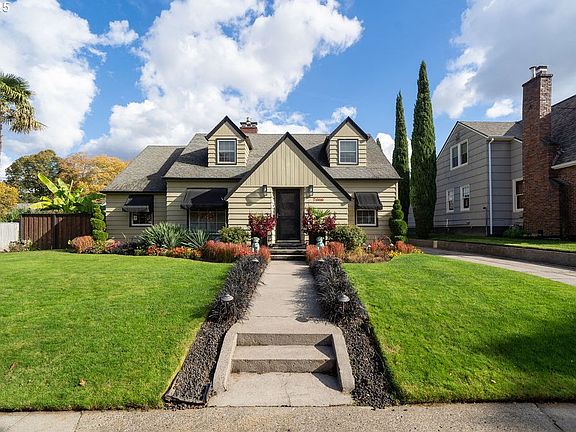 Welcome Home to historic Mock Crest treed lined neighborhood just off North Portlands famed bluff. A "City Retreat" awaits you with all the best features of the 1940's. A complete package of design inside and out! Thoughtfully remodeled and maintained with close attention to detail. Period architecture, high ceiling rooms filled with an abundance of natural daylight to enjoy and entertain all day through. Living room with inviting fireplace with freshly 2024 refinished wood floors adjoins the formal dining room with special period-built ins. Chef's gourmet kitchen offers designer appliances, distinctive wood cabinets, with breakfast nook area all overlooking the incredible lush garden with new sprinkler system. Option for owners bedroom also located on sought after main floor living which also overlooks the private outdoor living space, and garden. Plus a covered patio and outdoor dining area for relaxing or entertaining activities. Main floor hallway provides a remodeled bathroom, and second bedroom or ideal home office space. Upper floor provides additional option for primary bedroom suite with full bath, sitting area for reading, writing, or viewing TV. Lower level handsomely remodeled for Movie Night, Playroom, or Exercising, and also boasts abundance of storage space, laundry area, and additional studio room for your favorite hobby. Recent updates include refinished wood floors on the main, interior paint, and AC. Easy commute time to city, parks, university, schools, dining, shopping, hospital. Detached garage and private driveway!