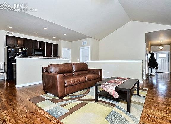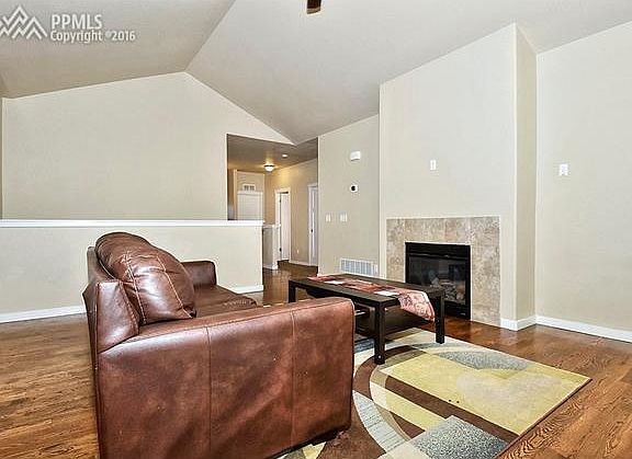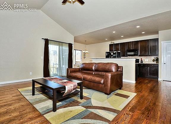 NO NEED TO WAIT For a New Build and Pay ALL THE EXTRAS! They're all here and MOVE-IN READY! This beautiful ranch model welcomes you home with rich hardwoods throughout the entry, living room, kitchen and dining room. The flowing, open floor plan makes family time and entertaining easy! Upgraded cabinets and gleaming granite create a kitchen that's a cook's dream. Cuddle up in front of the fireplace in the spacious living room or escape to the generous master bedroom, featuring a 5 piece master bath suite.. (Cont. below) ... with custom tile work. Just wait until you go downstairs! A huge, open great room awaits to accommodate the perfect man cave, game room or family room. Two generous bedrooms boast walk-in closets, and there's a ton of storage as well! All the expensive extras are already paid for: Fully professionally landscaped front and back yards, full fencing, sprinkler systems front and back, air conditioning, garage door opener, window blinds, window coverings, upgraded cabinets, upgraded hardwoods, and much more... Walking distance to a community park, EASY access to Fort Carson, and I-25... A beautiful home in a beautiful neighborhood!
