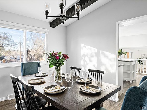 Beaming with charming updates, this home sits on a spacious lot in Ridgeview Hills South. Vaulted ceilings with exposed wooden beams greet residents in the entryway while an open floorplan unfolds with multiple living areas. A formal dining room leads into a stylish kitchen boasting stainless steel appliances and generous cabinetry. Warmed by a cozy fireplace, a welcoming living room offers seamless access to an enclosed back sunroom. Three second-floor bedrooms include the serene primary complemented by an en-suite bathroom. Downstairs, a fourth bedroom presents flexible space for guests or a home office. Enjoy outdoor relaxation in a private backyard oasis complete with a beautiful patio. Ample storage space is found in a basement with shelving, multiple sheds and a two-car attached garage. The home is equipped with new geothermal solar energy, ensuring energy efficiency. A central Centennial location provides proximity to Ames and Medema parks, Willow Spring Open Space and schools.