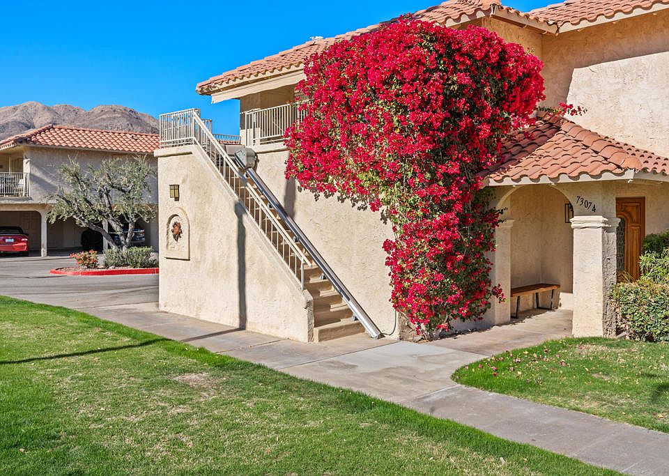 This 3 bedroom and 2 bath condo offers 1,170 square feet of comfortable living space in a terrific community. The location is perfect for easy access to Clubhouse, Tennis Pro Shop and a newly improved Workout Room. Community amenities include 12 pools, 4 hot tubs, a Bocce court, a golf putting green and 6 Pickleball courts. These shared facilities provide opportunities to enjoy a variety of outdoor activities and social interactions. Walk though the front door to discover a spacious Great Room that perfectly combines Living Room, Kitchen and Dining space into a very functional room. Another real highlight of this second story unit is a second story deck with mountain views of the Santa Rosa Mountain Range that tops out at 7,500 ft. This spacious and sunny deck provides a tranquil space for relaxing and enjoying outdoor dining. Deep Canyon is a unique community waiting for you to discover. Tennis here is among the very best in the valley and Pickleball is rocking, too. This is a very interactive social community where friendships are easy to make and often last a lifetime. A new Clubhouse competed only 3 years ago, is the community hub for parties, social gatherings and numerous activities including Bridge, games, quilting, Yoga and aerobics. Deep Canyon is waiting for you to discover and this home can easy turn into your seasonal or year-round residence. Discover it today!