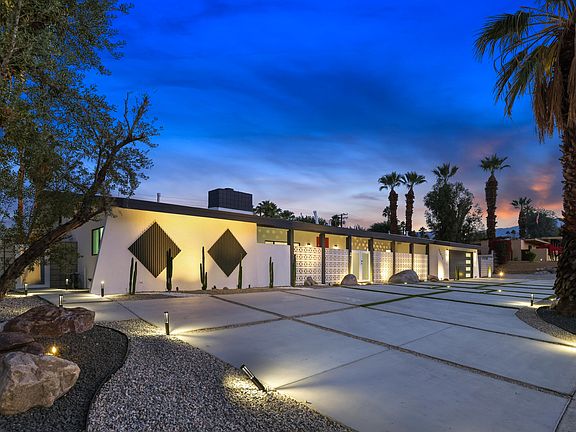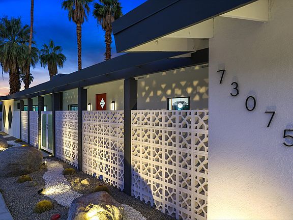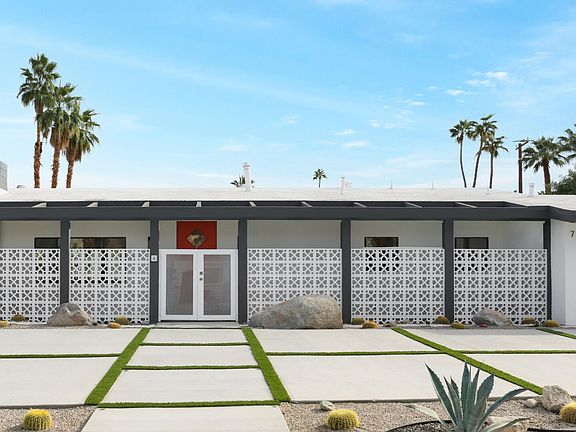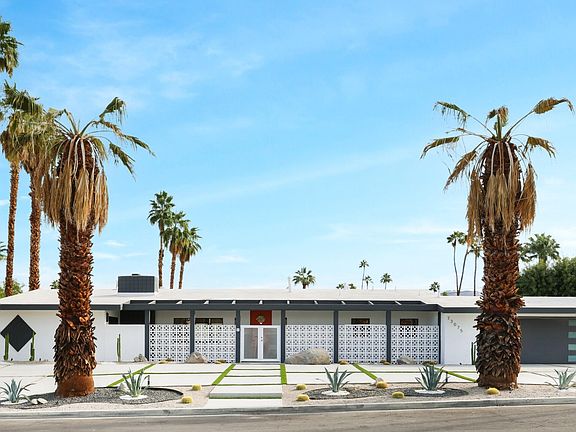 A rare find in this upscale South Palm Desert neighborhood of traditional luxury homes just a few short blocks from hiking and El Paseo shopping and restaurants, this masterfully renovated 1965 Mid-Century Modern is quite the dream come true for the most particular Buyer. The sweeping curb appeal with panoramic mountain views will pique your curiosity wanting to see more. Once inside, you'll discover an extraordinary mini estate on half acre grounds offering 3BR/3BA Main House plus newly built 2BR/1BA Private Guest House with Kitchenette - complemented by the vast private backyard with expansive Cabana, New Pool, Spa and Tanning Shelf, Fire Pit, BBQ, Outdoor Shower. Eye-catching enhancements are impressive with high-end designer finishes throughout both homes. Porcelain Terrazzo Flooring and Tongue and Groove ceilings extend through walls of glass in the Main House creating an open continuum between inside and outside - accentuating Desert living at its best. New Bathrooms. New Kitchen with quartz counter tops, wood cabinetry, and Viking appliances connects effortlessly to the dining and living space with Fireplace and Big Views. Primary Suite, Bedroom #2 with private bath, and Bedroom #3 all offer direct access to the outside. Circular Driveway and Two Car Garage accommodates multiple vehicles plus gated RV Parking. Kudos to Shawn Elmore of Special Effects Staging and Design for his meticulous attention to detail and Violet Moran's Revive Team for an exceptional renovation.