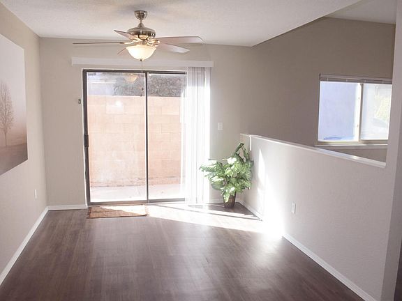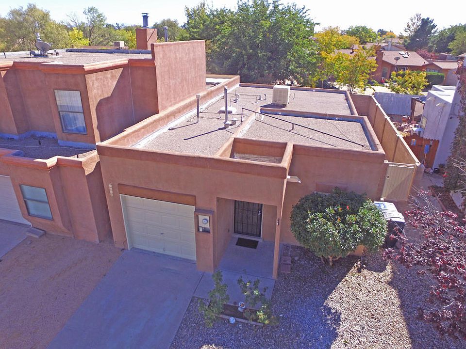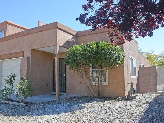 Beautifully updated townhome! High ceilings give this home a spacious light and and airy feel. Great floor plan. Recent updates: fresh paint, brand new EZ care flooring, and new carpet in bedrooms, brand new blinds throughout, five new ceiling fans, new vanities, decorative mirrors and light fixtures in both bathrooms, new counter tops in kitchen, new range oven and hood. Recent dishwasher. Double pane windows. Finished one car garage with garage door opener.New security wrought iron gate to side yard patio. NO POLY. No HOA fees. PLUS location, location, location! EZ access to Golf, shopping, restaurants, petroglyph park, dog park and I-40 highway. HURRY over and You can be Home for the Holidays!