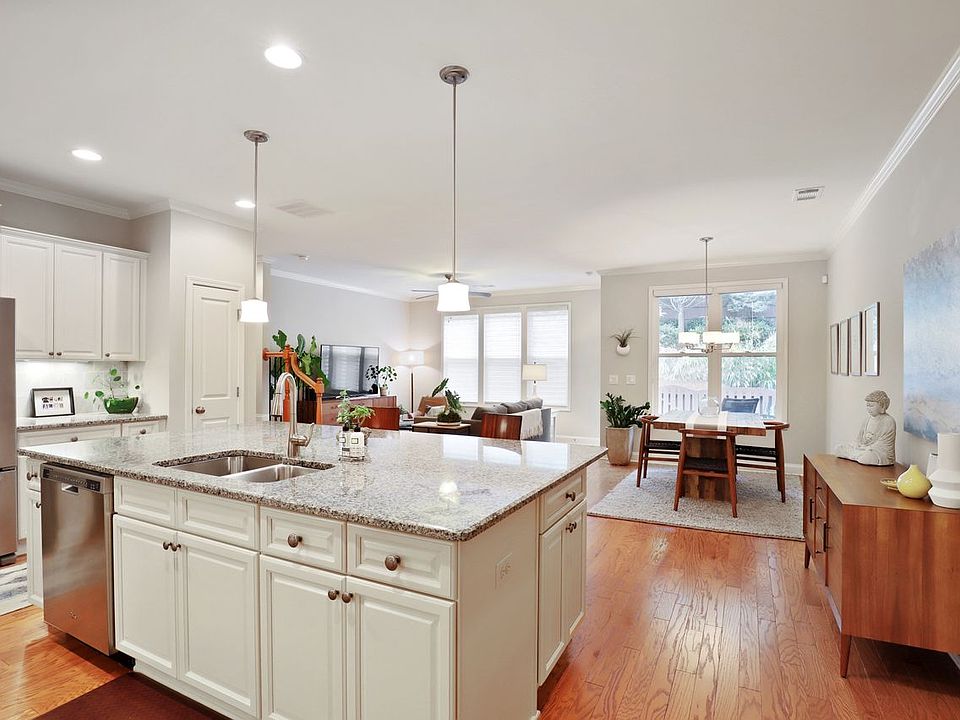 • Kitchen Features: Breakfast Bar, Eat-in Kitchen, Pantry, View to Family Room, Stone Counters, Kitchen Island, Cabinets White