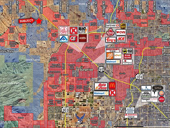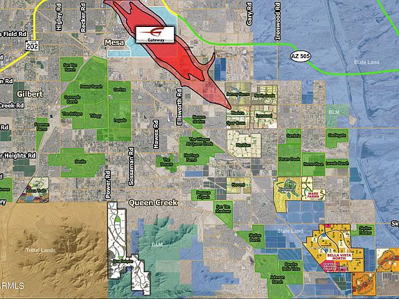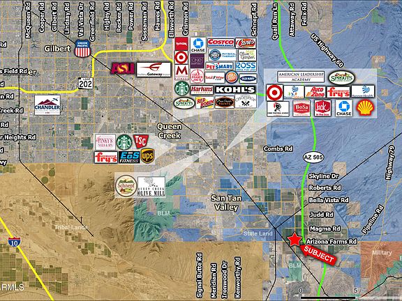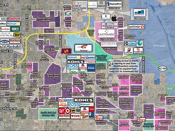 Comments: Property is located on the immediate corner of two major arterial roads within the Johnson Ranch/southeast valley booming submarket. Site is half a mile west of the future interchange at Highway 24 Arizona Farms Interchange. As one of the fastest growing submarkets, this is site is within the path of growth/ development area of thousands of new homes. The site has several million dollars of infrastructure including +/-7,500 sq. ft. climate controlled building with 18 and 14 ft roll up doors and over 100,000 sq. ft. of concrete pad laid out. Multiple possibilities including storage, industrial uses, private business, etc.