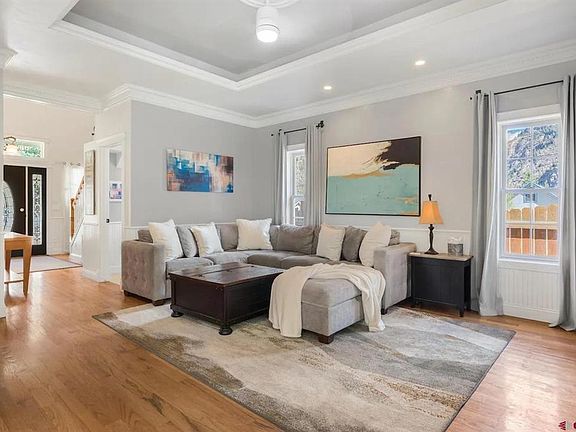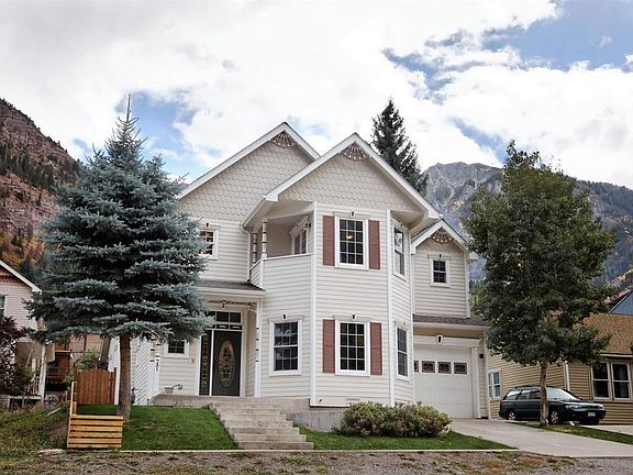 One-of-a-kind Victorian-style home with 5 bedrooms and 3.5 bathrooms, only one block off Main Street in Downtown Ouray! Ample living, dining, and kitchen space and fully furnished with 2 king beds and 3 queen beds. All furniture stays! The main-level primary suite is large and very comfortable, with a generous walk-in closet. The energy-efficient tankless water heater provides hot showers for you and your guests. Newer refrigerator and dishwasher. Huge upstairs laundry room provides extra storage, and the attached garage with many storage cabinets provides even more. Unwind after a long day of outdoor adventuring on the back patio in the beautifully landscaped, enclosed backyard, and enjoy the hot tub with unparalleled views of the valley. The home is very quiet, so you can enjoy the proximity to Main Street without the noise. There's no other property like it in Ouray!