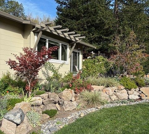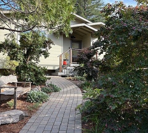 The home for rent is a cottage in the rear of the property. It is situated on the second level of the back property, so it is very private with regard to the main home. Newly built in 2022, the "cottage" has soaring cathedral ceilings, with floor to ceiling windows in the main room, all looking out on lush gardens and a small redwood forest. The cottage is accessed by a pathway with a slight incline and has 5 steps to the front door. Thoroughly modern kitchen, european style cabinetry with large island which also contains a Miele Washer Dryer. There is one full spacious walk in shower bathroom, and an additional 1/2 bath. Central heat and air, hardwood floors, except tile in bath. Sunny throughout, skylights add to the natural light. Both bedrooms are generously sized with large closets containing Elfa closet systems. The home is all electric. Costs for both water and electricity are included with the rent. The pictures hardly do it justice - see it to believe it! No smoking allowed. Trash service included in rental amount.