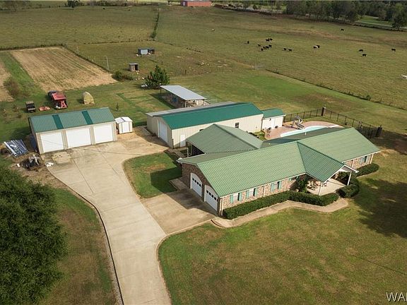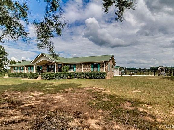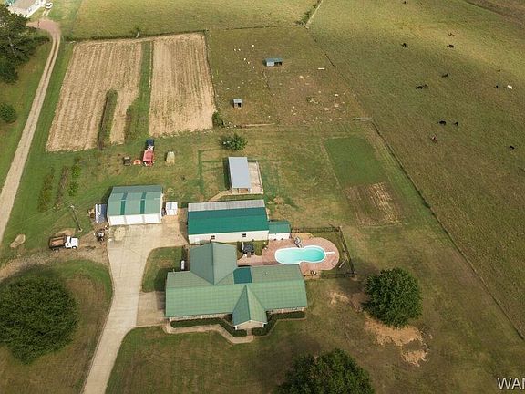 What a find!!! 5 Acre Farm country living just 2 minutes from town or 30-40 minutes from Tuscaloosa! Come experience this amazing updated 3BR/2BA all brick home with a large two car garage and a metal roof featuring over 2,000 sq. ft. of heated/cooled space with new kitchen countertops, backsplash, cooktop and fridge, new hardwood floors, updated master bathroom, concrete driveway, pool, hot tub, pool house (with bath), screened in 20 x 28 outdoor kitchen, two metal shops/outbuildings-34' x 60' and 24' x 40' with a 11' lean too. The grounds of this property also features a large 1 acre garden spot, fenced in area for animals (used for goats at the present time) with small sheds, grape vineyards, large outdoor dog kennel (separate septic system from main home) and indoor dog kennel.