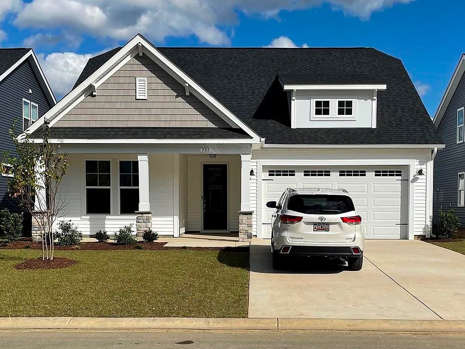 Step in from the Shorebreak’s covered front porch to find 3 bedrooms, 2 bathrooms, an open kitchen, dining, and great room area finished with a beautiful tray ceiling. Breeze through sliding glass doors onto a large covered porch, ideal for warm summer evenings or afternoon get-togethers. Through the foyer, you’ll find a large drop zone and laundry area. Drop-off beach chairs in the convenient storage space just inside the garage, as well. Across from the drop zone is a spacious third bedroom. Beyond the open living space, find a stunning owner's master suite complete with a tray ceiling, enormous walk-in closet, double vanity, and a seated shower. Go ahead, kick your feet up, sit back, and relax among the day-to-day comforts and spaciousness of your new home in Heritage Park!