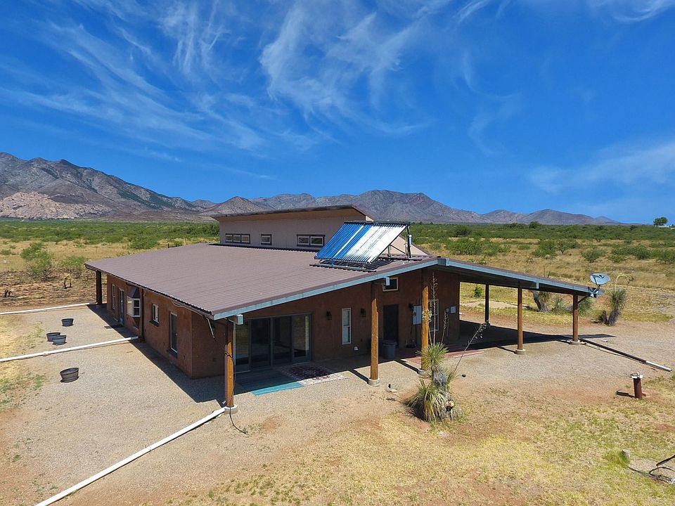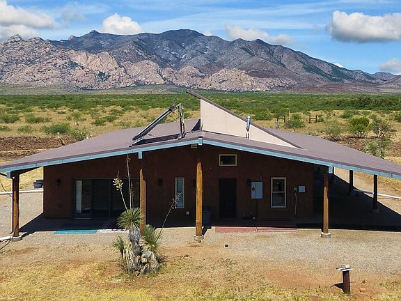 Fully sustainable straw bale home, with steel construction, was completed in 2010 with heart & great attention to detail to create a beautiful, rare living space. Elevation is close to 5000 ft with new 50 yr backup batteries, along with PV solar power, you are off the grid! There are 16 ft ceilings with clerestory windows that open to allow night mountain air to cool the home. Neutral colors VOC free clay pigment & earthen floors with radiant heat. There are deep wrap-around porches & sitting areas that show off the stunning Dragoon Mountains, sunsets & sunrise views. The gourmet, island kitchen has unique granite, SS appliances, a pot filler, 6 burner gas range, porcelain farm & separate vegetable sink, french door refrigerator & separate commercial fridge & freezer in a huge pantry for