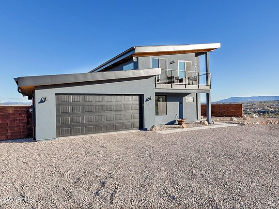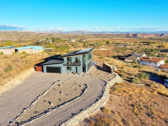 PANORAMIC VIEWS! New custom/uniquely designed contemporary home provides incredible views from every corner of the house. See the sun rise over Sedona/Verde Valley, then watch it set over Mingus Mountain from the outside balcony; you can star gaze by night or enjoy the peaceful sounds of nature by day. No wasted space in this home! It is maximized for open flow and outdoor feel. Low maintenance living with a side of relaxation. Pool placement and design maximizes the views and inspires relaxation. Custom built benches in the pool provide views from every side while the water fall feature provides a relaxing sound. Travertine tile surrounds the pool and connects to front patio and walkway for a seamless consistent look and feel. Woven warn metal fence provides privacy where you need while rebar fencing provides unobstructed views. Every rock in rock wall, rock wash, and landscaping border came from lot and meticulously placed by owner. No detail was missed in the design of this house. Enjoy the natural flow of nature around the large circular driveway sprinkled with Baby Rita and other subtle cactus plants. Make it your home or a short term rental as location is in high demand due to its private and tranquil setting and proximity to Jerome and Sedona. (Owner holds an active real estate license in FL)