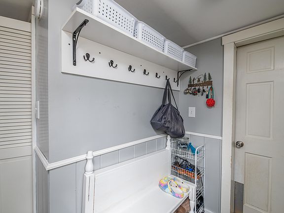 A standout feature is the two-bay insulated garage, complete with ample storage space above, catering to both practical needs and hobbies.