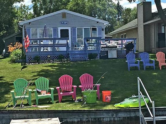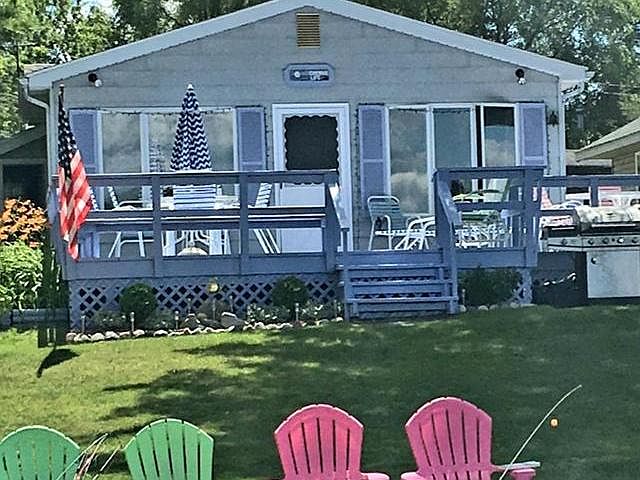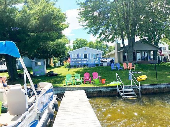 Super cute and clean property on all sports Lake 13!! This cottage sits on a point, and is surrounded by water and fantastic views. Sandy bottom frontage with gradual depth, about chest high at end of dock. Very large deck currently set up with seating for 18. Huge living area with space for 4 couches, plus additional furniture. Large shed for toys and lawn equipment. Currently sleeps 10 in beds with double bunk bed in second bedroom and 2 queen sleeper sofas. Tons of parking on this 52x301 foot lot, plus room for a garage. Brand new seawall completed 6/20/20. Great lake community and neighbors!! Lake is stocked and offers fantastic fishing. Five minutes from downtown Clare, located in the center of the state. B731S