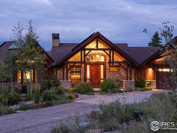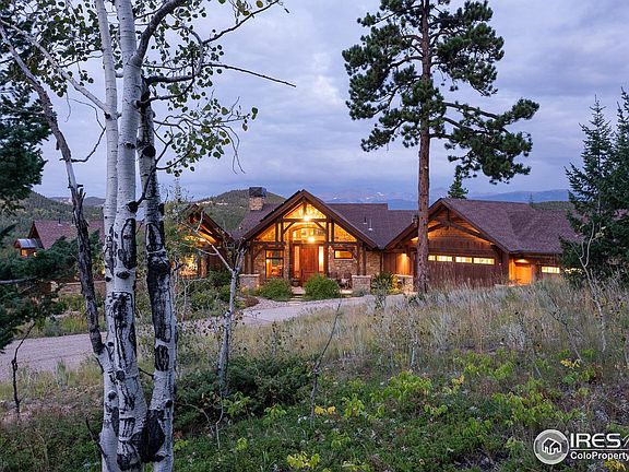 Welcome to your dream home nestled in serene Twin Sisters Ranch on 11.8 acres and just 20 minutes from Downtown Boulder! This pristine 3,855 SF timber frame ranch home is a masterpiece, marrying top tier craftsmanship and the highest end finishes available. It is a remarkable living experience! Enter the home through a 10ft African mahogany door set against Telluride Colorado stone. Elegant hammer beam trusses with steel rods add a touch of sophistication to the already impressive architecture. The expansive main level features oversized Marvin windows, capturing 260-degree panoramic views of lush forestland and snow-capped peaks. Living room, dining room and kitchen flow seamlessly together with a captivating Telluride stone fireplace and Buff stone mantle as the focal point. The full chef's kitchen is a dream! Featuring a beautiful Carrara Calacatta marble center island and custom European cabinetry. Prepare meals effortlessly with top-of-the-line appliances including a Sub-Zero refrigerator/freezer, Wolf gas cooktop, Thermador double-oven, and Miele dishwasher. As you stand at the sink, you'll be captivated by the majestic views. A grandiose wraparound porch adds a stunning second living space to entertain and enjoy the views. The dedicated primary suite wing offers a private balcony and contemplative sitting area. The bathroom is a true masterpiece, featuring aspen tree frosted glass rooms that encase a private toilet and separate steam shower. The his & hers vanities are set on either side of a large sunlit soaking tub. A large walk-in closet offering plenty of storage space. Descend the hickory stairs into the lower level. A media/family room and two guest bedrooms offer plenty of space for entertaining and hosting. The 3-car heated garage adds extra ease in the colder months. Conveniently located just 20 min from Boulder and Nederland, it is the perfect balance of seclusion and accessibility.